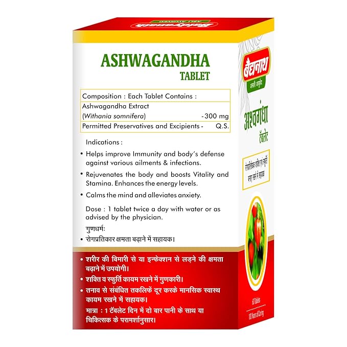 बैद्यनाथ अश्वगंधा टैबलेट तनाव के प्रति शरीर की प्रतिक्रिया को नियंत्रित करने में मदद कर सकता है। यह आरामदायक नींद लाने और समग्र जीवन शक्ति व ऊर्जा में भी योगदान दे सकता है।