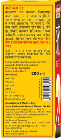 बैद्यनाथ बालंत काढ़ा नंबर 2 में मुख्य सामग्रियों में देवदारू (भारतीय देवदार), वाचा (मीठा झंडा), पिप्पली (लंबी काली मिर्च), और सोंठ (सूखी अदरक) शामिल हैं। अन्य महत्वपूर्ण घटक हैं हरीतकी, चिरायता (स्वर्टिया चिराता), कुटकी (पिक्रोरिज़ा कुरोआ), और गिलोय (टिनोस्पोरा कॉर्डिफ़ोलिया)। ये जड़ी-बूटियाँ व्यापक प्रसवोत्तर सहायता प्रदान करने के लिए मिलकर काम करती हैं।