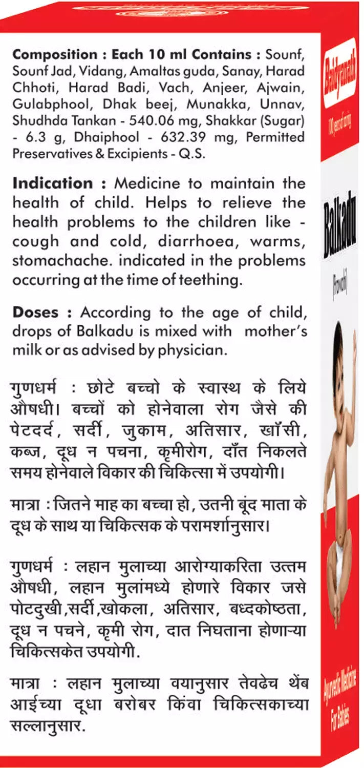 बैद्यनाथ बालकाडु का उपयोग शिशुओं और छोटे बच्चों में होने वाली आम बीमारियों, खासकर दांत निकलने के दौरान, को कम करने में मदद के लिए किया जाता है। यह खांसी, सर्दी, दस्त और पेट दर्द से राहत दिला सकता है जो अक्सर दांत निकलने की प्रक्रिया के दौरान होते हैं। ये बूंदें कृमि संक्रमण और पाचन संबंधी विकारों को दूर करने में भी मदद करती हैं, जिससे बच्चे के संपूर्ण स्वास्थ्य में सुधार होता है।