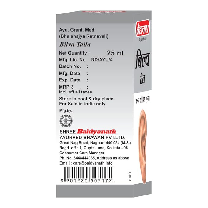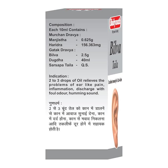 बैद्यनाथ बिल्व तेल के संभावित लाभों में कान के दर्द और बेचैनी से राहत, इसके रोगाणुरोधी गुणों से कान के संक्रमण से लड़ने में मदद और जलन को शांत करना शामिल है। यह टिनिटस को नियंत्रित करने और कान की नलिकाओं को धीरे से साफ़ करके कान की स्वच्छता को बढ़ावा देने में भी मदद कर सकता है। यह कान में दर्द, लगातार बजना, भिनभिनाना या सीटी बजना, और सुनने की क्षमता में कमी सहित कान की विभिन्न समस्याओं को दूर करने में मदद करता है।