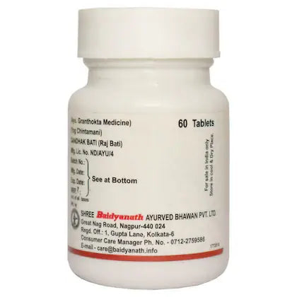 बैद्यनाथ गंधक बटी (राज बटी) की मुख्य सामग्रियों में शुद्ध गंधक (शुद्ध गंधक), अदरक (सोंथा), नींबू का रस (निम्बू रस), और सेंधा नमक (सैंधव नमक) शामिल हैं। फॉर्मूलेशन में सेंधा नमक जैसे अन्य तत्व भी शामिल हैं, जो पेट में एसिड के स्तर को संतुलित करने में मदद करता है और पाचन में सहायता करता है।