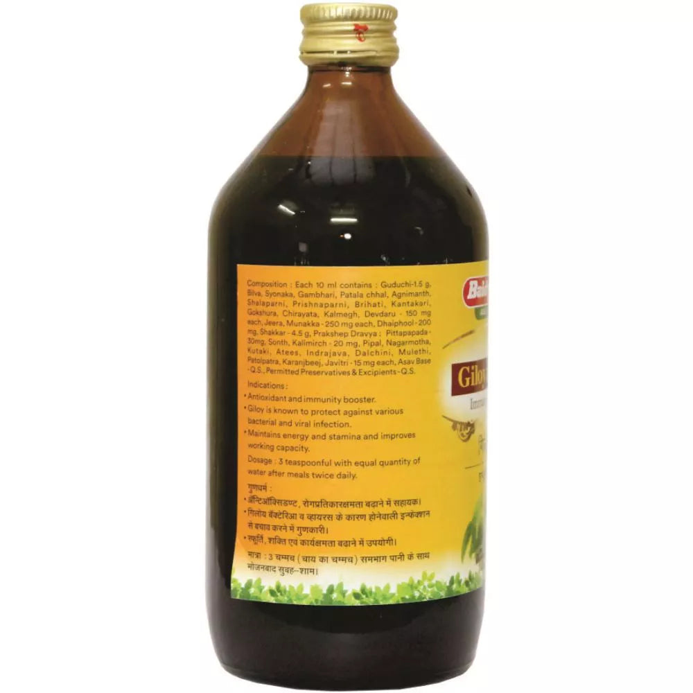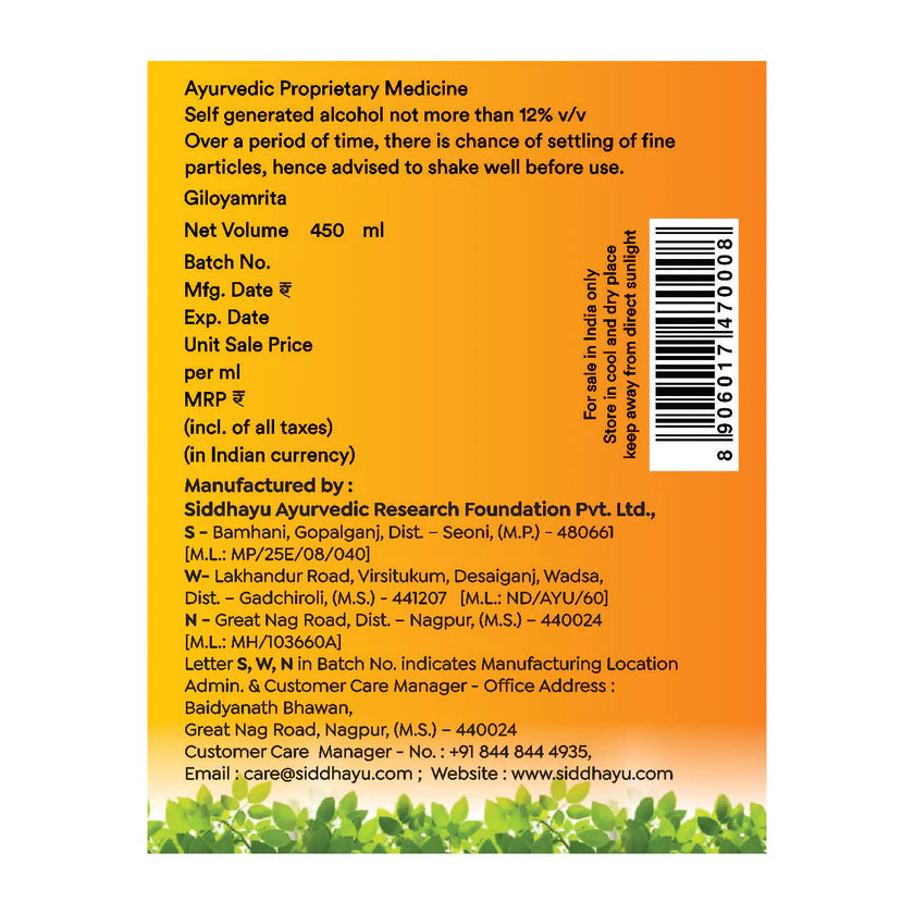 बैद्यनाथ गिलोय अमृता में मुख्य सामग्री में आमतौर पर गिलोय (गुडुची), मुनक्का, यष्टिमधु और पीपल शामिल हैं।
