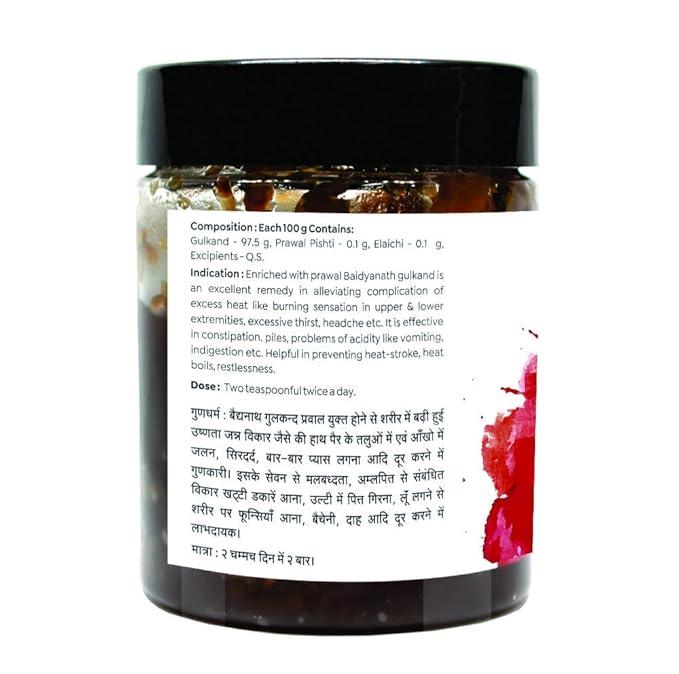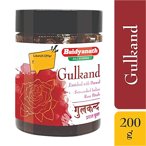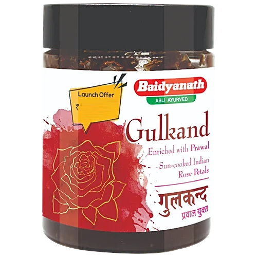 बैद्यनाथ गुलकंद (प्रवाल युक्त) शरीर की आंतरिक गर्मी को कम करने के लिए एक प्राकृतिक शीतलन प्रभाव प्रदान करता है और हीटस्ट्रोक और हीट फोड़े को रोकने में मदद कर सकता है। यह एक प्राकृतिक एंटीऑक्सीडेंट के रूप में कार्य करता है, झुर्रियों को कम करने और एंटी-एजिंग एजेंट के रूप में कार्य करता है। इसके अतिरिक्त, यह पाचन स्वास्थ्य को बेहतर बनाता है, अल्सर और कब्ज को रोकने में मदद करता है, और कैल्शियम का एक समृद्ध स्रोत है।