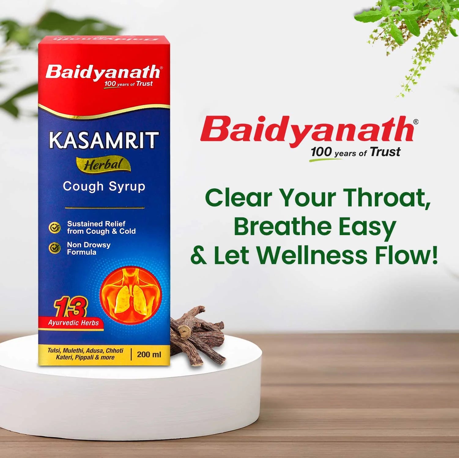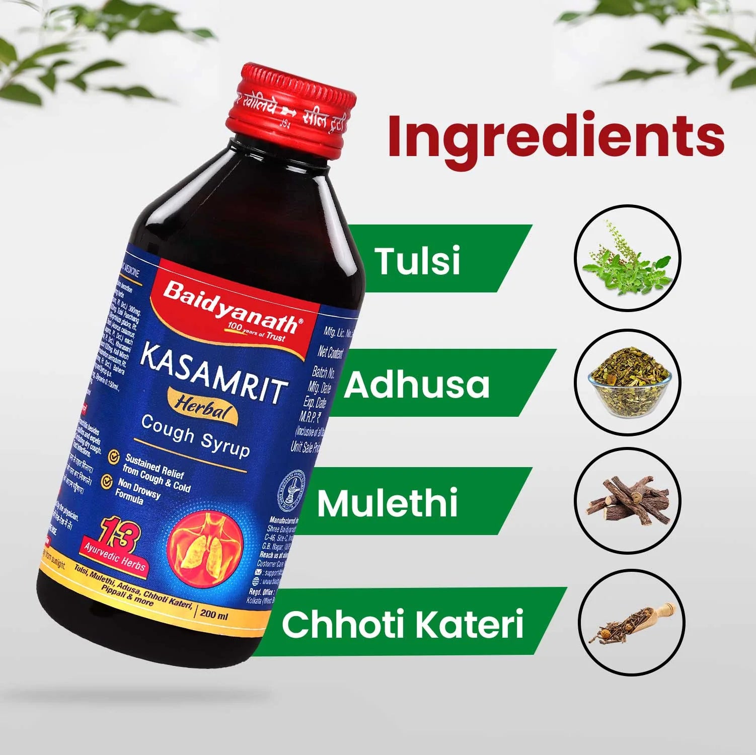 बैद्यनाथ कासमृत हर्बल में मुख्य सामग्री तुलसी और मुलेठी हैं, जो अपने सूजन-रोधी और कफ-निस्सारक गुणों के लिए जाने जाते हैं। इसमें कंटकारी भी है, जो श्वसन मार्ग को साफ़ करने में मदद करती है, और पिप्पली, जो पारंपरिक रूप से गले पर आराम पहुँचाने के लिए इस्तेमाल की जाती है। इसके अतिरिक्त, इस मिश्रण में अतिरिक्त लाभों के लिए वासाका, सोंठ, दालचीनी और शहद जैसी जड़ी-बूटियाँ भी शामिल हो सकती हैं।