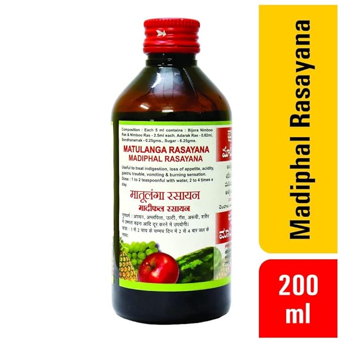 इस फॉर्मूलेशन में मदिरा (नींबू) जैसे प्रमुख तत्व शामिल हैं, जो पारंपरिक रूप से मतली से राहत और पाचन में सुधार के लिए जाने जाते हैं। अन्य घटकों में हरीतकी, द्राक्षा (किशमिश), मिश्री (चीनी), और नींबू स्वरस (नींबू का रस) शामिल हैं, जिन्हें पाचन में सहायता के लिए उनके पारंपरिक आयुर्वेदिक उपयोगों के लिए चुना गया है।