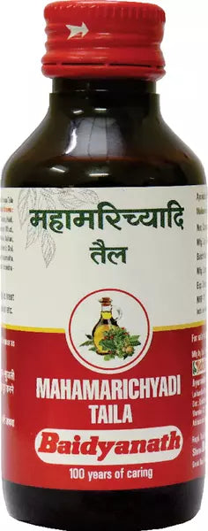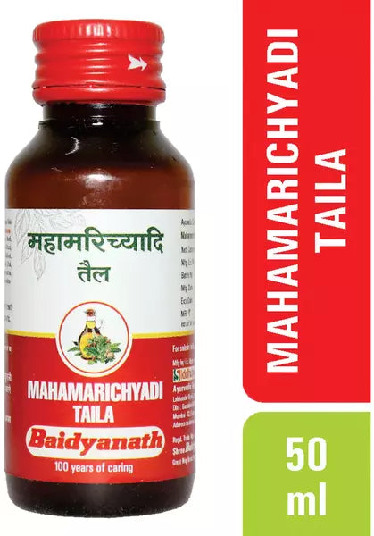 यह तेल खुजली, फोड़े-फुंसी, सूजन और त्वचा पर चकत्ते जैसी विभिन्न त्वचा संबंधी समस्याओं से राहत दिलाने में विशेष रूप से सहायक है। इसका उपयोग एक्जिमा, सोरायसिस, मुँहासे, सेप्टिक घाव और फंगल संक्रमण से जुड़े लक्षणों को कम करने के लिए किया जा सकता है। बैद्यनाथ महामरिच्यादि तेल पित्ती, दाद और अन्य त्वचा संक्रमणों से भी राहत प्रदान करता है।