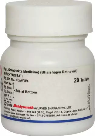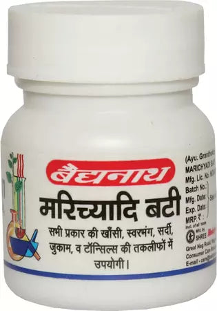 बैद्यनाथ मरीच्यादि बटी का उपयोग विशेष रूप से खांसी, सर्दी और फ्लू के लक्षणों, जैसे गले में खराश और जकड़न से राहत दिलाने के लिए किया जाता है। इसका उपयोग अपच, एसिडिटी और सीने में जलन जैसी पाचन संबंधी परेशानियों में भी किया जाता है। इसके अलावा, यह ब्रोंकाइटिस और अस्थमा जैसी श्वसन संबंधी समस्याओं के लिए भी संकेतित हो सकती है।
