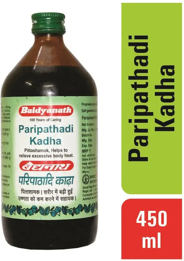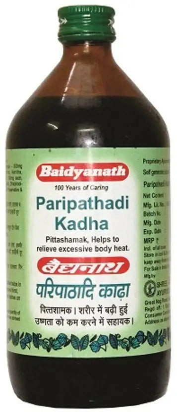 बैद्यनाथ परिपाठादि काढ़ा विशेष रूप से त्वचा पर होने वाले दाने, चकत्ते और छालों को कम करने के लिए उपयोग किया जाता है, खासकर खसरा, चेचक और दाद से होने वाले छालों को। यह हाथों, पैरों और आँखों में होने वाली जलन को कम करने में मदद करता है, और आँखों के नीचे होने वाली घमौरियों और काले घेरों को भी कम करता है। इस मिश्रण का उपयोग शरीर की अत्यधिक गर्मी और ज्वर के बाद होने वाली जलन से संबंधित स्थितियों को नियंत्रित करने के लिए भी किया जाता है।