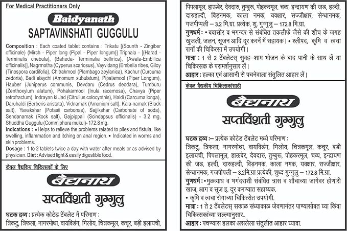 बैद्यनाथ सप्तविशांति गुग्गुलु के उचित उपयोग के बारे में व्यक्तिगत मार्गदर्शन के लिए किसी योग्य आयुर्वेदिक चिकित्सक से परामर्श करना अत्यंत आवश्यक है, क्योंकि यह व्यक्तिगत आवश्यकताओं और स्वास्थ्य स्थितियों के आधार पर भिन्न हो सकता है। आमतौर पर, इस मिश्रण को गर्म पानी या शहद के साथ, भोजन के बाद लेना बेहतर होता है।