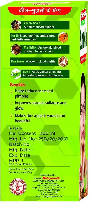 यह आयुर्वेदिक टॉनिक मुख्य रूप से रक्त शोधन और मुँहासे, फुंसी, फोड़े, एक्ज़िमा और त्वचा पर चकत्ते जैसी विभिन्न त्वचा संबंधी समस्याओं के उपचार के लिए उपयोग किया जाता है। यह यकृत के कार्य को भी बेहतर बनाता है और दाद और अन्य त्वचा संक्रमणों जैसी स्थितियों को नियंत्रित करने में मदद कर सकता है।