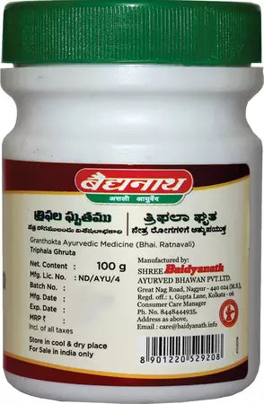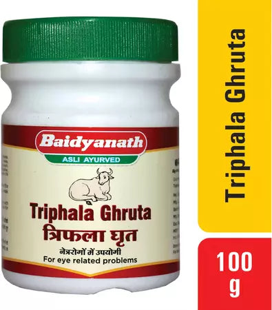 बैद्यनाथ त्रिफला घृत की प्रमुख सामग्रियों में हरीतकी, बिभीतकी, अमलाकी (त्रिफला के तीन फल), नागरमोथा, हल्दी (हल्दी), मुलेठी (यष्टिमधु), द्राक्ष (किशमिश), और गाय का घी (स्पष्ट मक्खन) शामिल हैं। इन सामग्रियों को पारंपरिक आयुर्वेदिक तरीकों के अनुसार संसाधित किया जाता है।