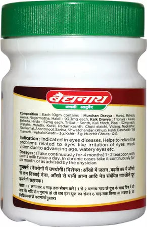 किसी स्वास्थ्य सेवा पेशेवर या आयुर्वेदिक चिकित्सक के मार्गदर्शन का पालन करना ज़रूरी है। आँखों के स्वास्थ्य के लिए, इसे मुँह से लिया जा सकता है या पलकों पर बाहरी रूप से लगाया जा सकता है। इस उत्पाद का उपयोग करने से पहले, खासकर गर्भवती या स्तनपान कराने वाली महिलाओं के लिए, किसी स्वास्थ्य सेवा पेशेवर या आयुर्वेदिक चिकित्सक से परामर्श करना ज़रूरी है।