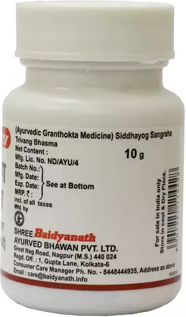 त्रिवंग भस्म बच्चों के लिए संकेतित नहीं है, और गर्भावस्था या स्तनपान के दौरान इसकी सिफारिश नहीं की जाती है; वयस्कों के लिए, खुराक 65 से 250 मिलीग्राम तक होती है, विभाजित खुराकों में अधिकतम संभव दैनिक खुराक 500 मिलीग्राम है।